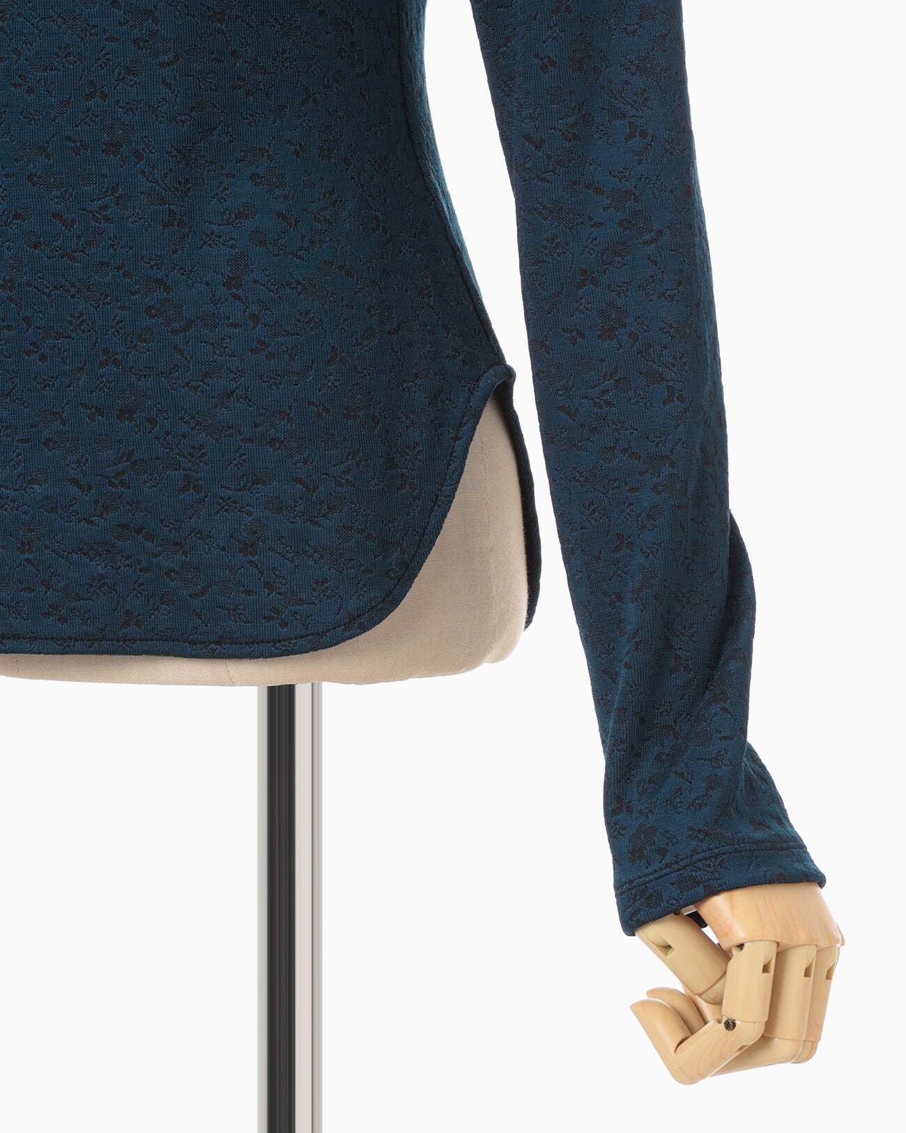 レーヨンをベースにナイロンポリウレタンの糸で小花柄を表現することで、柄の部分に収縮が生まれ凹凸を出すことで立体的な奥行きのある表情に。しなやかなジャージー素材が心地よく身体に寄り添い、シンプルなシルエットとサラッとした生地感が通年着用しやすく、レイヤースタイルやあらゆるボトムスと高相性で汎用性のある1着。