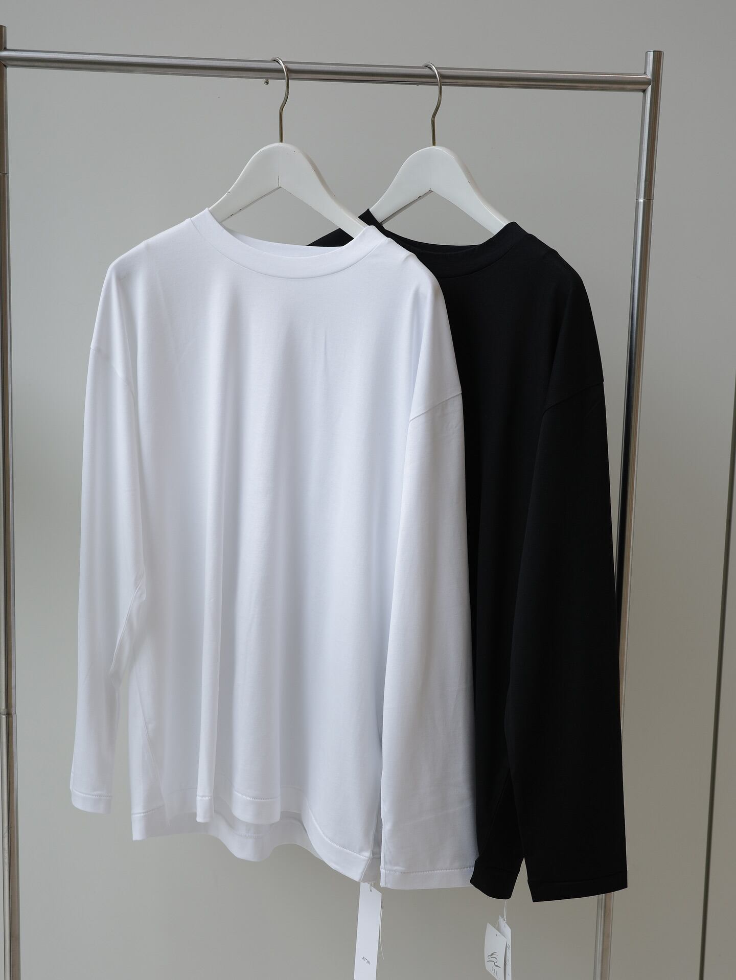 オーバーサイズが特徴のATON定番ロングスリーブTシャツ。ゆとりのあるシルエット、横幅に対し縦の比率が少し長く、モードな印象です。男性向けですが、素材に落ち感があり、女性がオーバーサイズで着用できる1着です。
