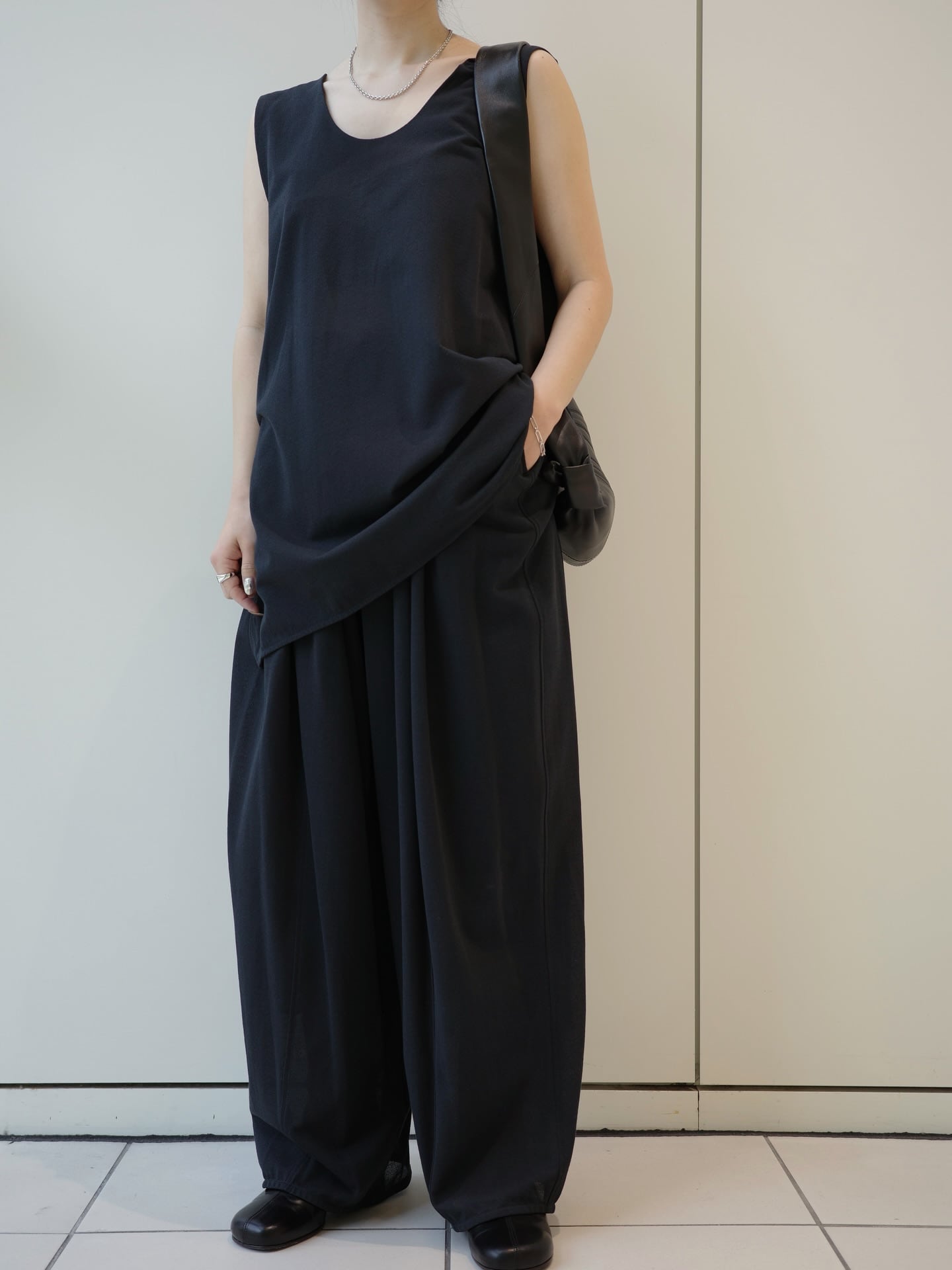 度詰で編み立てたまるで布帛のような梨地生地を贅沢に使用したギャザーバレルパンツ。