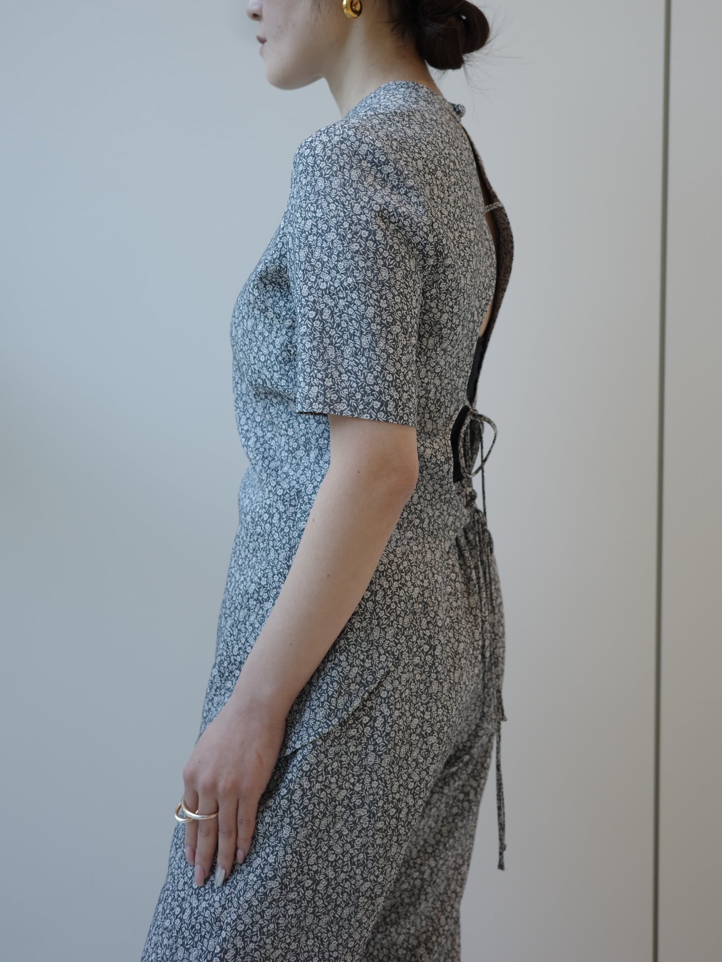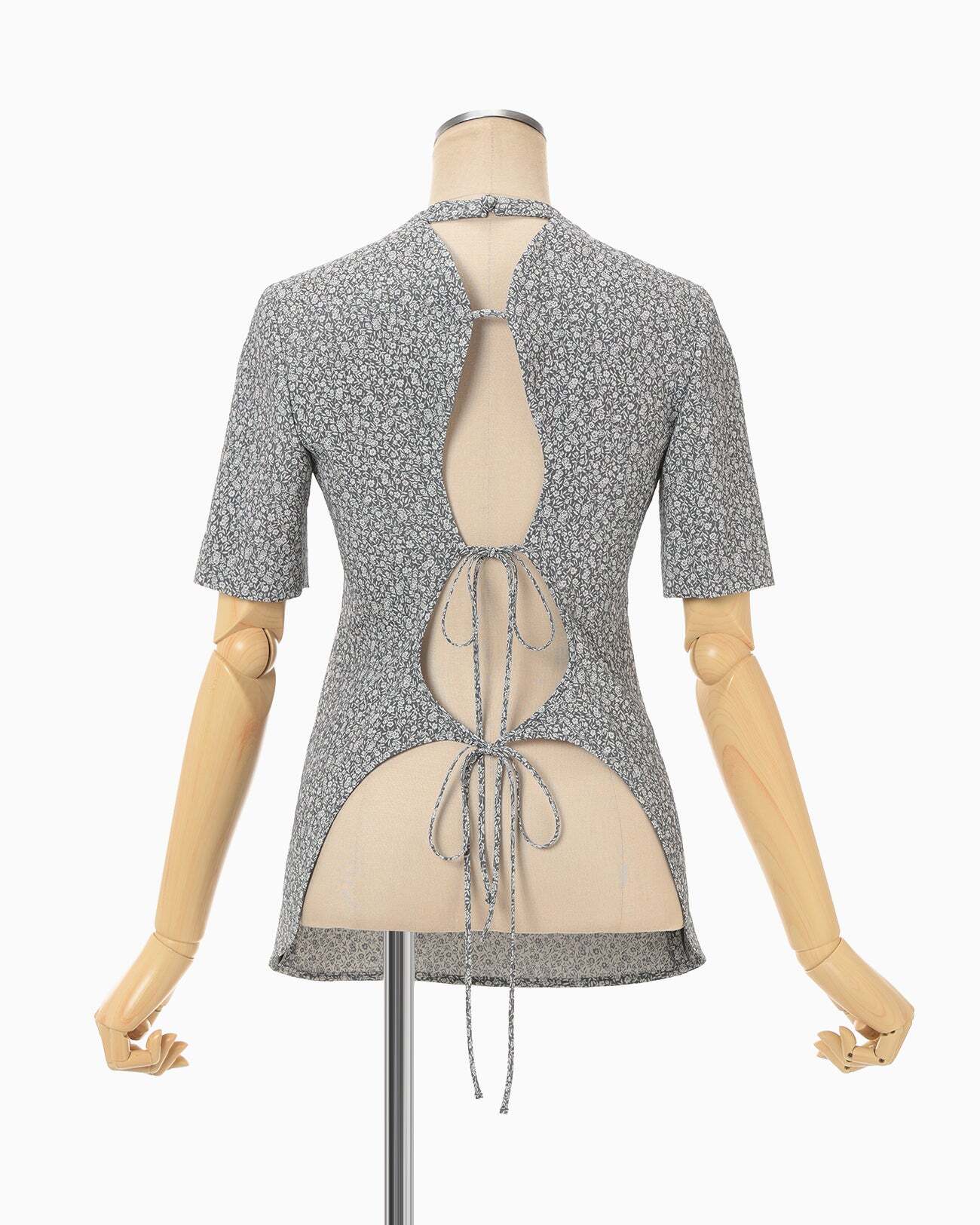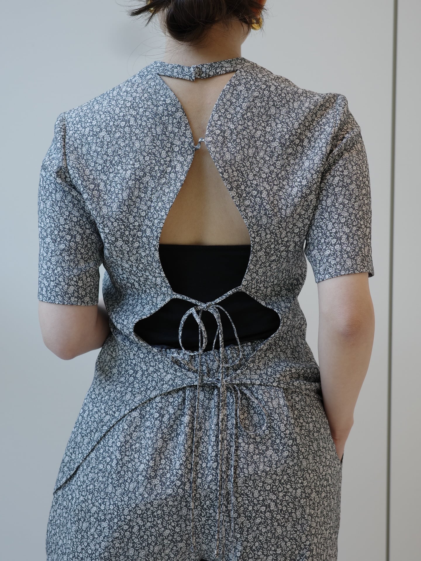 生地の表面に独特な凹凸のある小花柄ジャカード生地を使用したトップス。工場などで使用される表面に独特なシボ感のある不織布を花柄ジャカード生地で表現。大胆に開いたバックスタイルが自然でしなやかな曲線を描き、美しいシルエットを演出する。二の腕までカバーする5分袖と背中に配したリボンが軽やかで立体的なシルエットを作り出す1着。