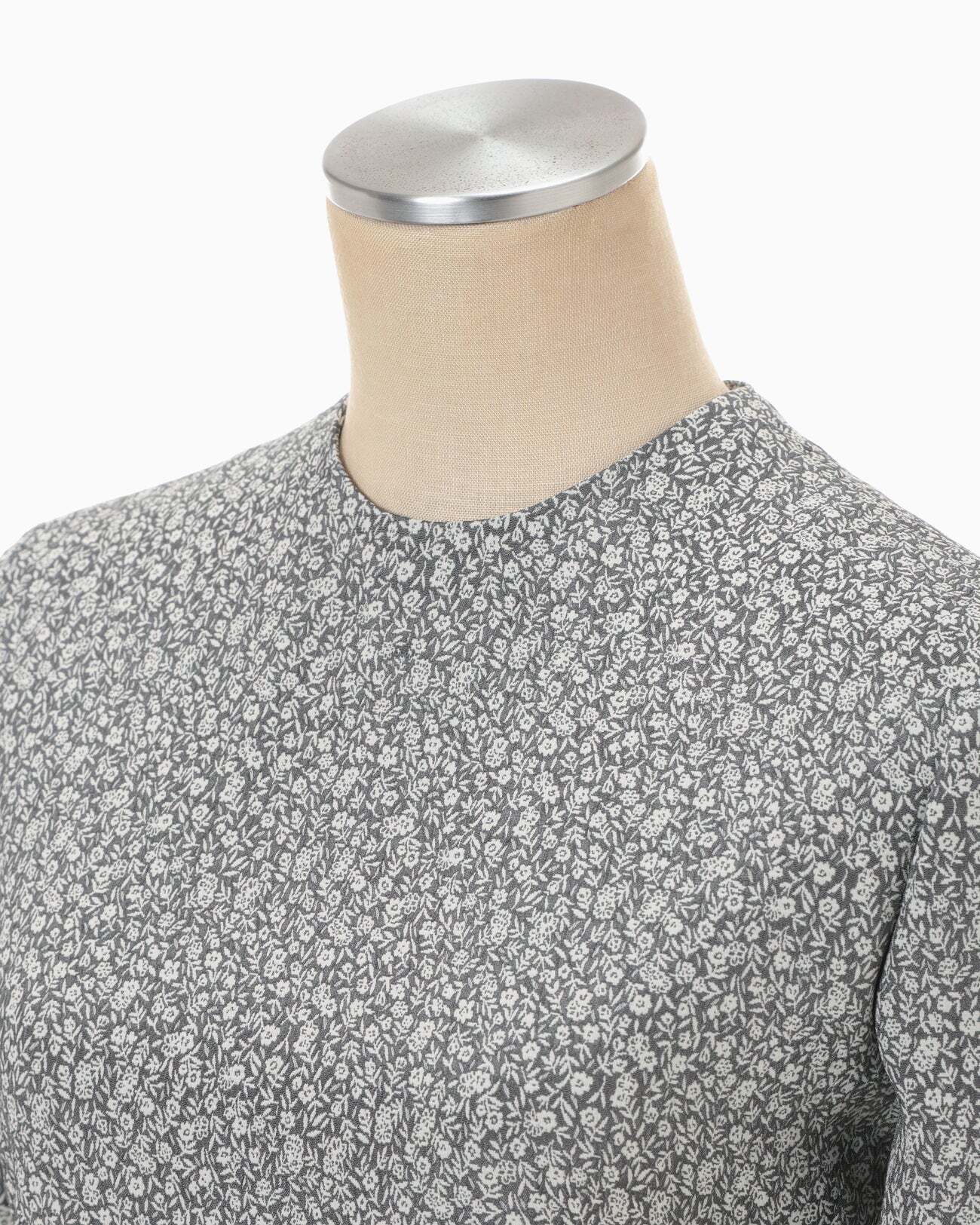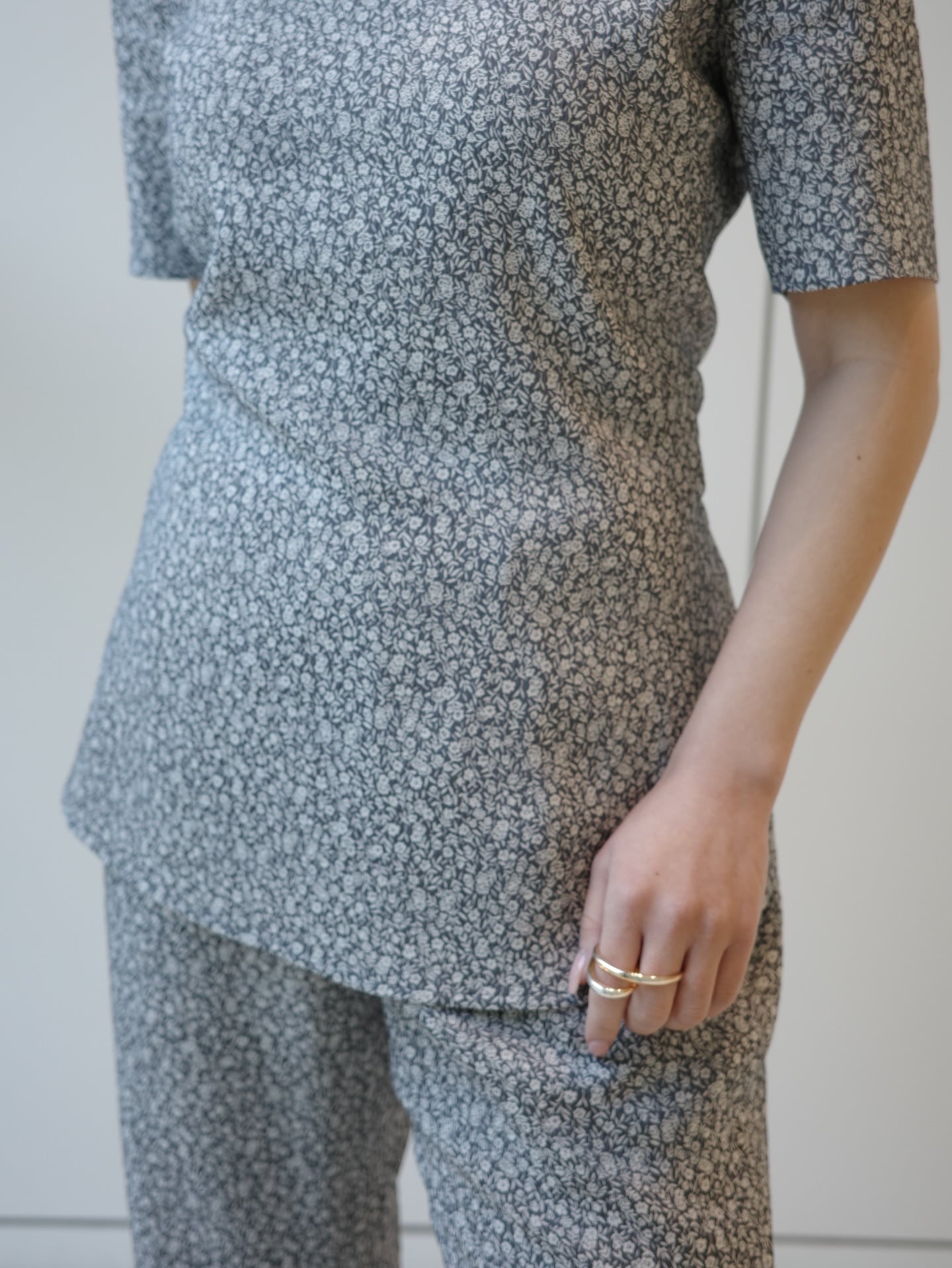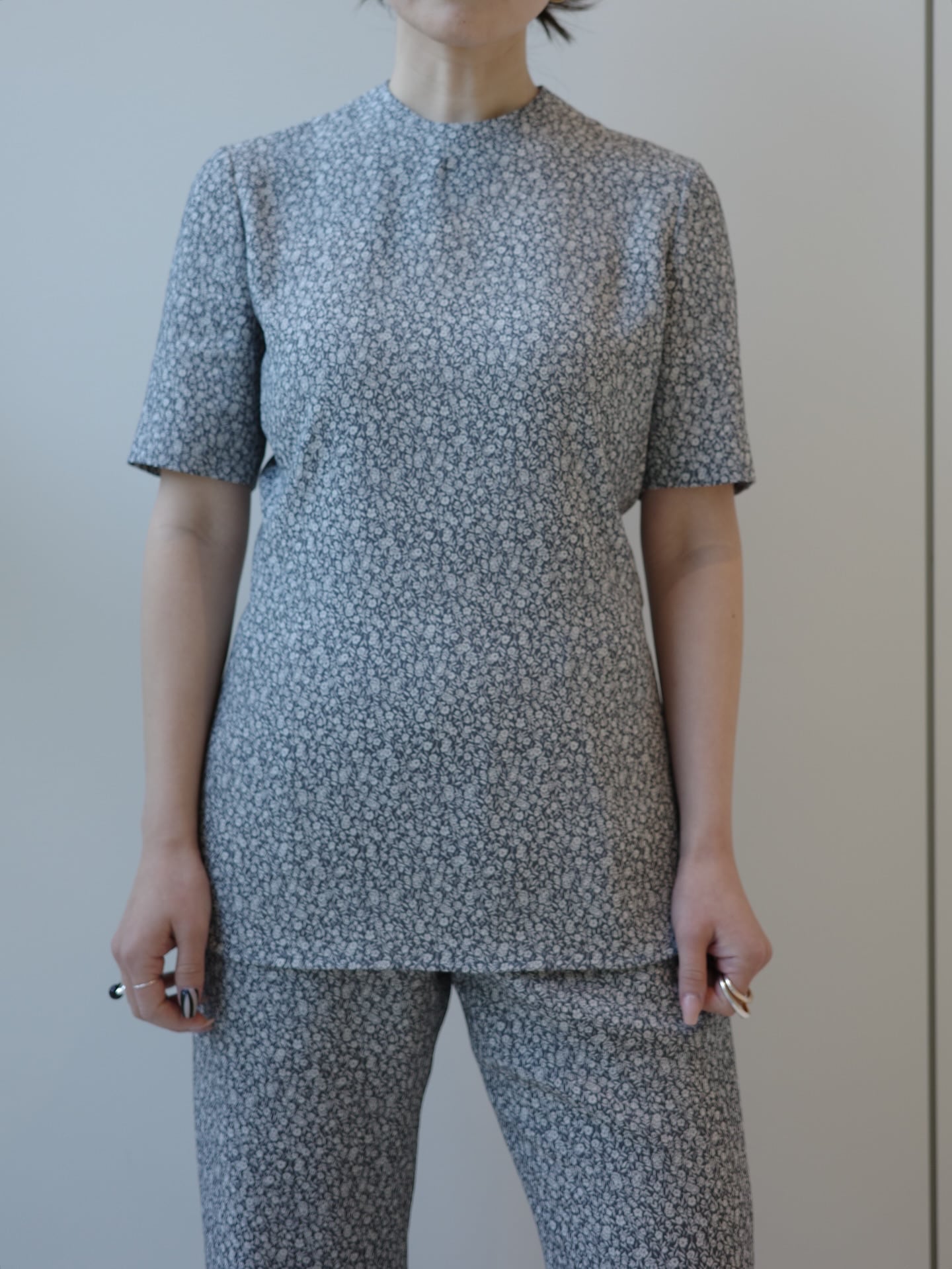 生地の表面に独特な凹凸のある小花柄ジャカード生地を使用したトップス。工場などで使用される表面に独特なシボ感のある不織布を花柄ジャカード生地で表現。大胆に開いたバックスタイルが自然でしなやかな曲線を描き、美しいシルエットを演出する。二の腕までカバーする5分袖と背中に配したリボンが軽やかで立体的なシルエットを作り出す1着。