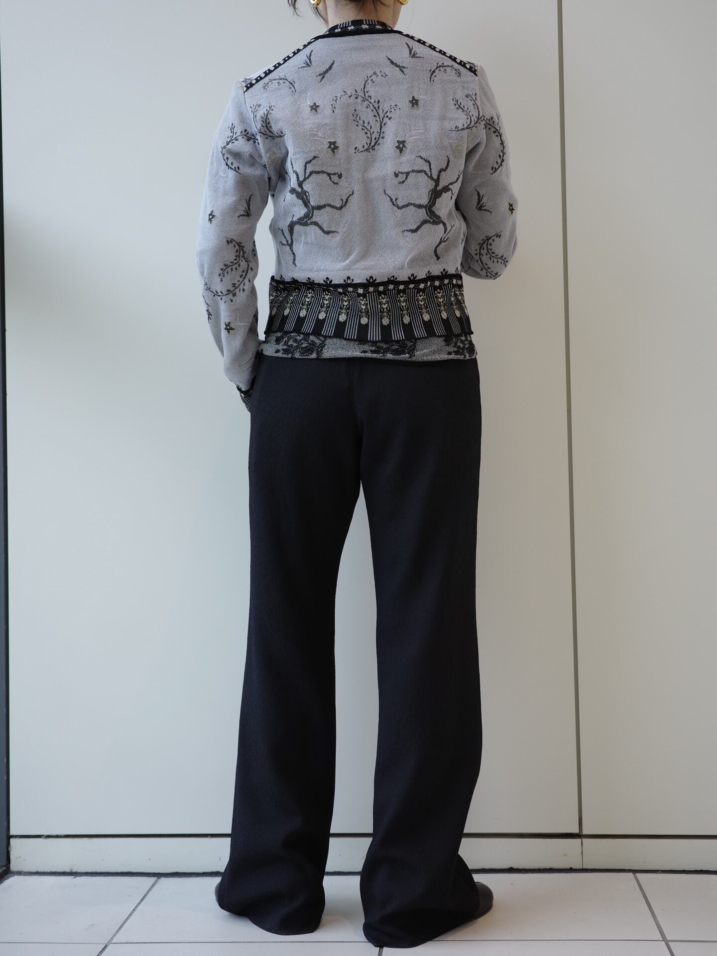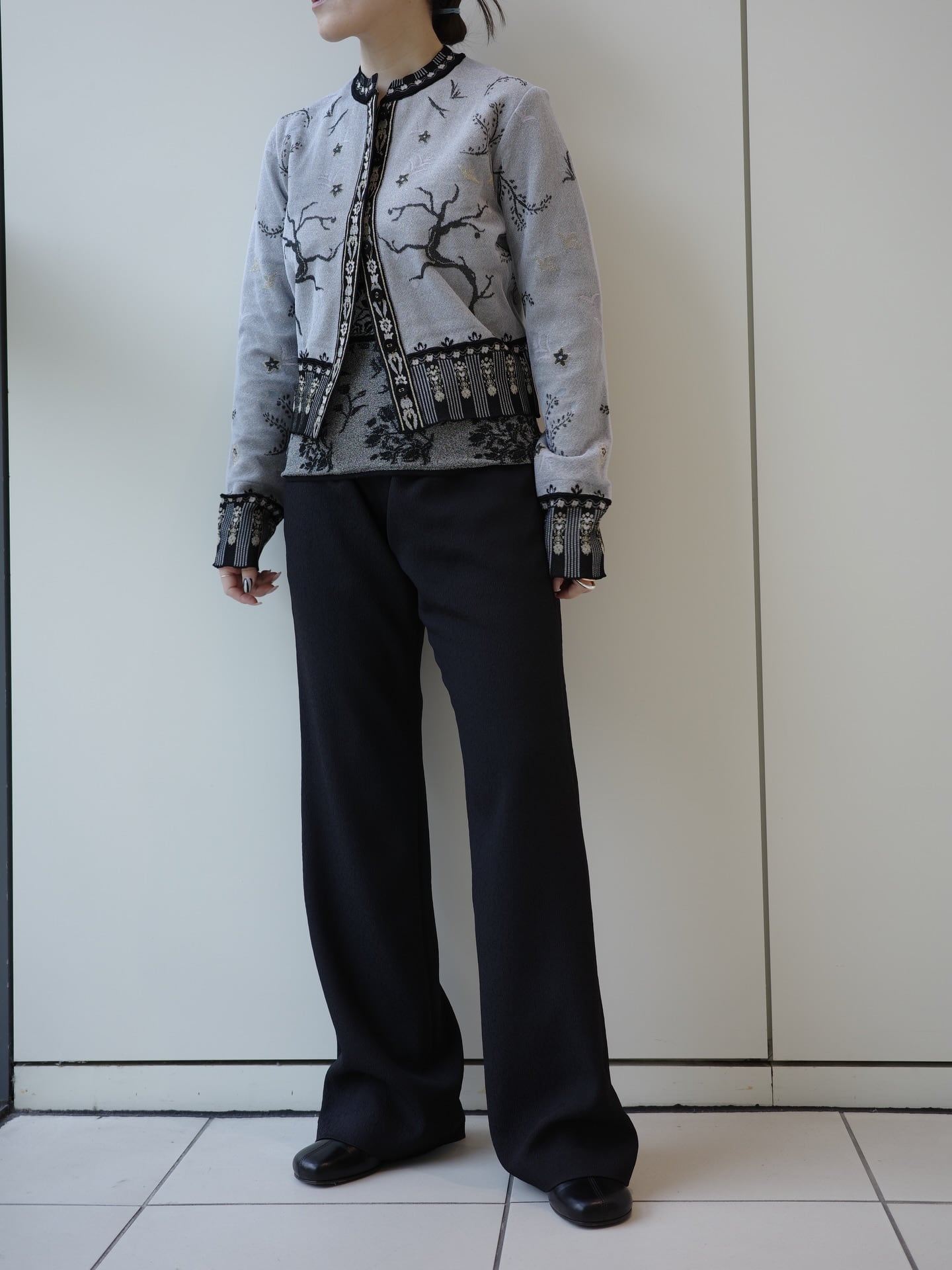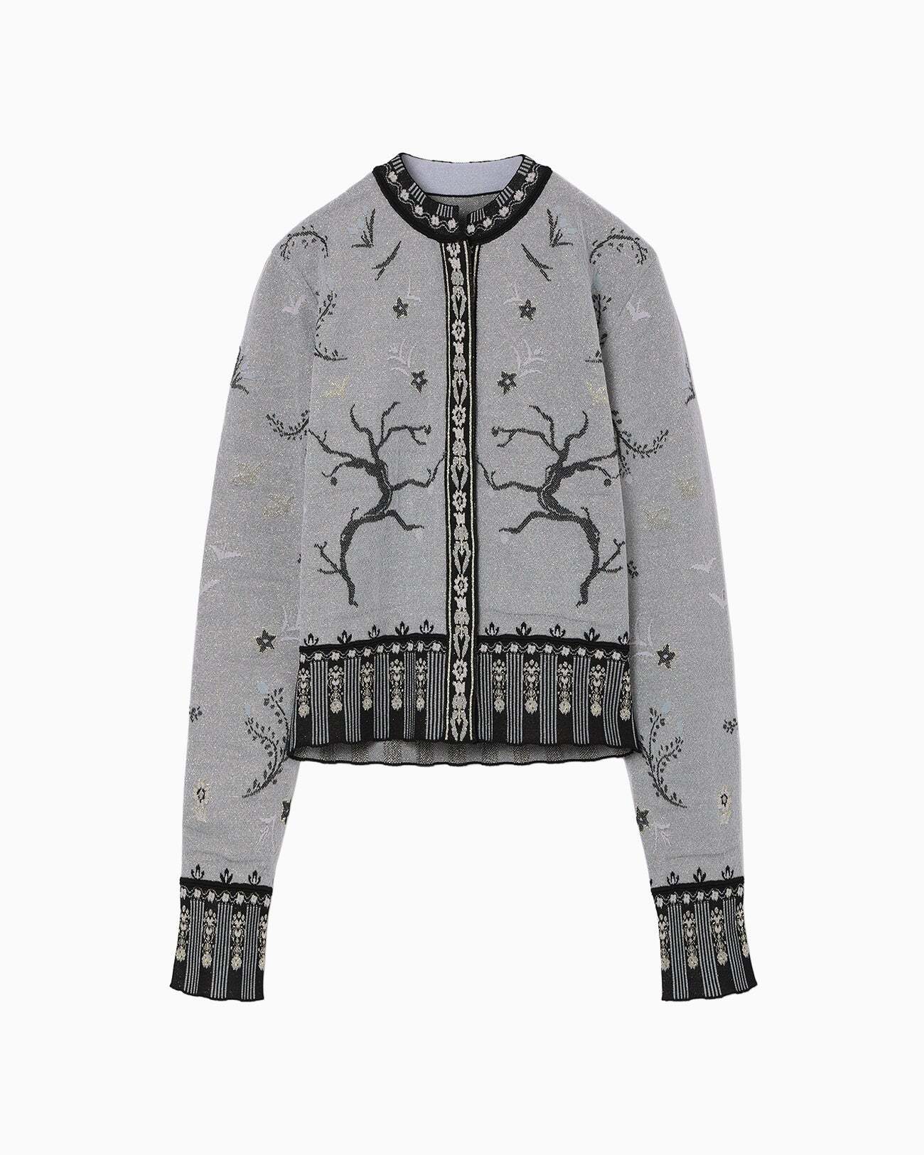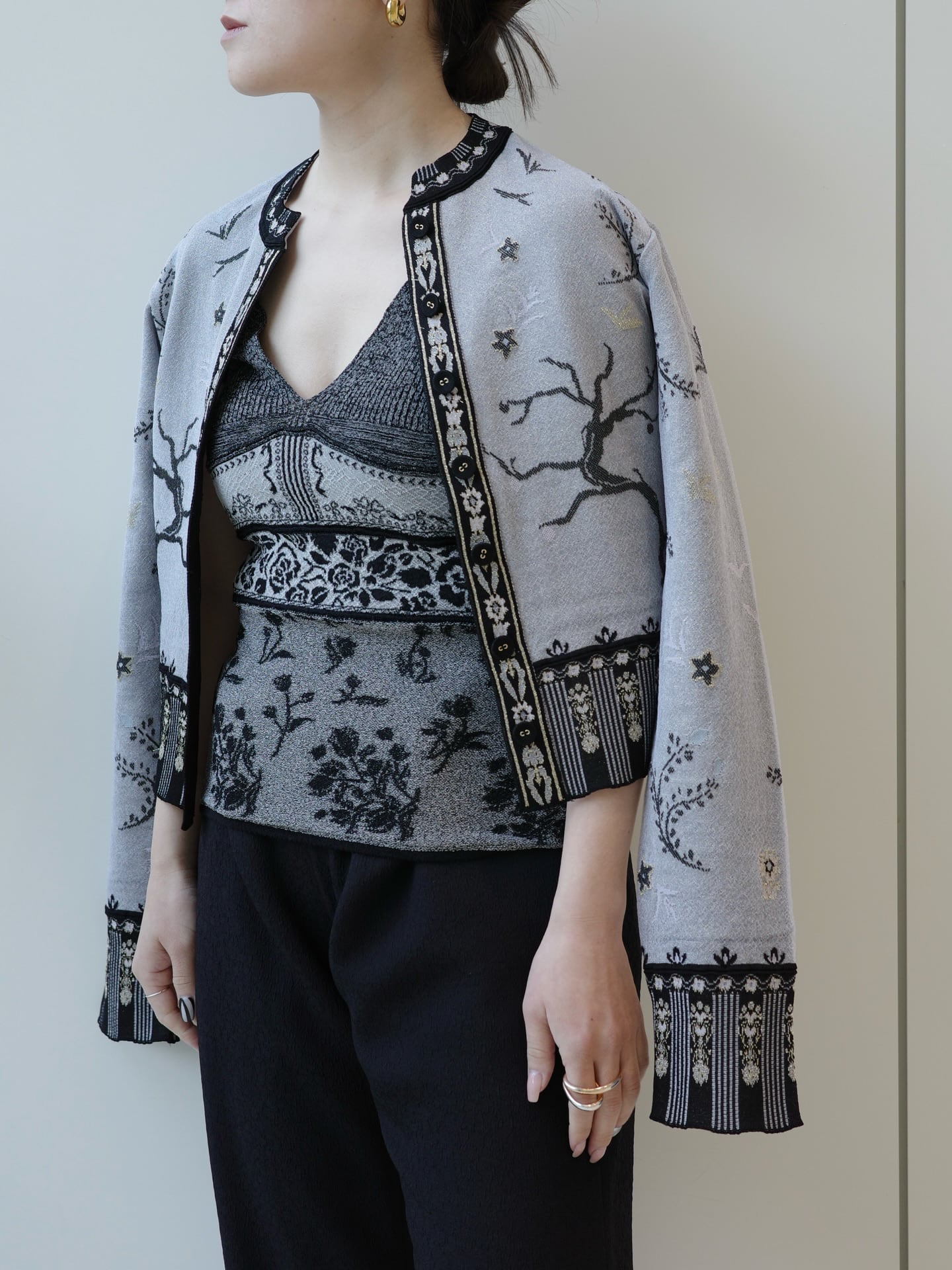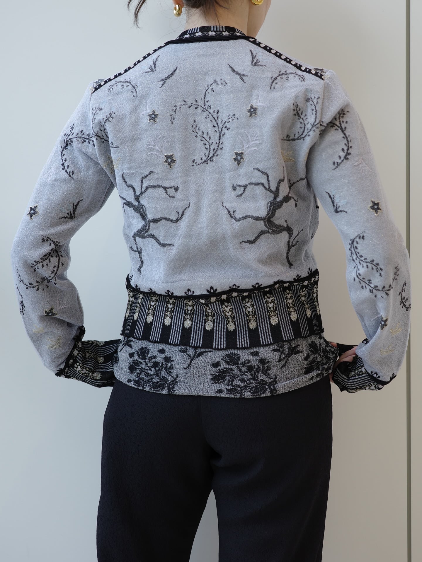 ガラスの絵付けのような繊細な柄と透け感が美しいニットカーディガン。西洋のガラス工芸に見られる筆による絵付けの花柄をニットジャカードで再現。ラメ糸を用いた二重の編み地が奥行きのある表情を生み出す。コンパクトなサイジングが上品な印象を与え、細やかなディテールが随所に散りばめられた1着。