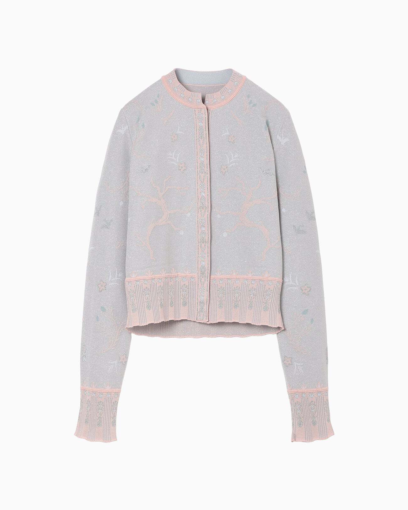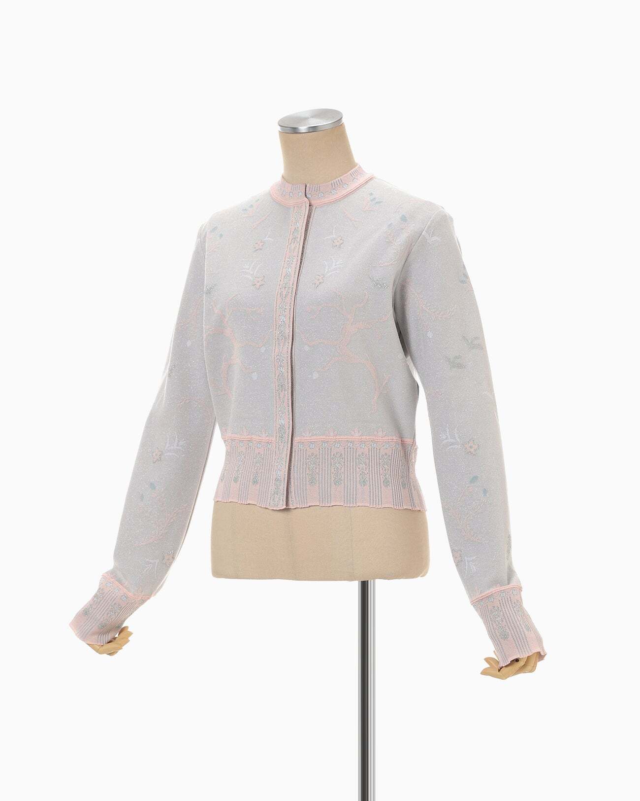 ガラスの絵付けのような繊細な柄と透け感が美しいニットカーディガン。西洋のガラス工芸に見られる筆による絵付けの花柄をニットジャカードで再現。ラメ糸を用いた二重の編み地が奥行きのある表情を生み出す。コンパクトなサイジングが上品な印象を与え、細やかなディテールが随所に散りばめられた1着。