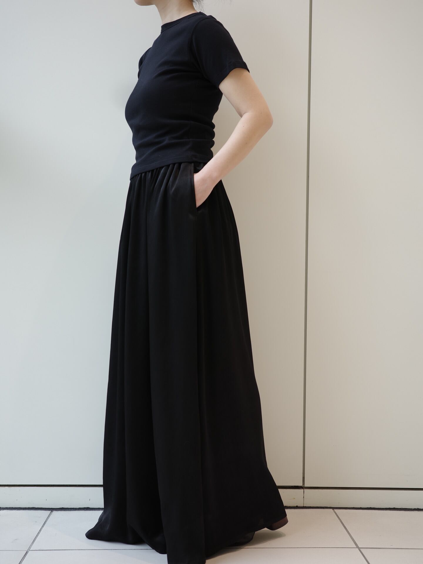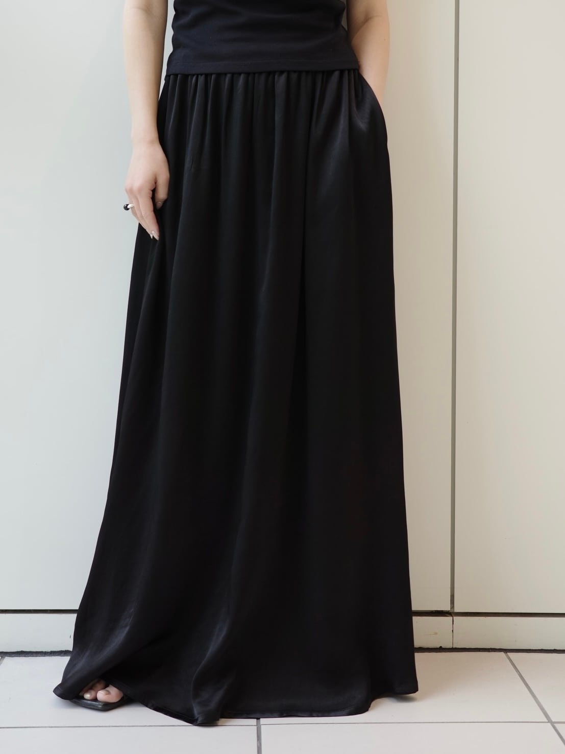 コラーゲン素材を贅沢に用い、日本で仕立てたオリジナルサテン生地を使用したスカート。 ウエスト部分にたっぷりとギャザーをとり、裾にかけて自然に広がるシルエット。立体感のあるデザインで生地の光沢と質感を存分に楽しめます。 両サイドにポケット付き。